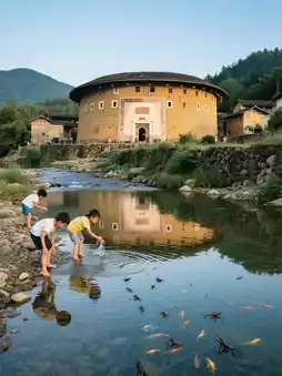 🔹 **Tianluokeng Tulou Cluster**: Don’t just snap photos of the "Four Dishes and One Soup"! Stroll along the stone-paved paths between the Tulou, where you might meet grannies carrying bamboo baskets👵🏻 or even step into a local’s home for a bowl of warm ground tea. At sunset, the entire Tulou glows orange—head to the viewing platform for stunning silhouette shots!