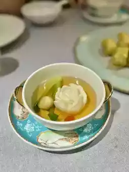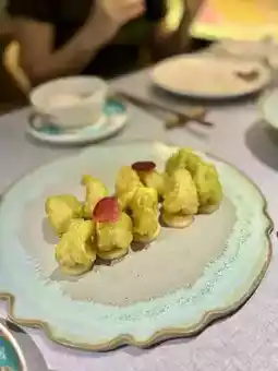 The shrimp balls in Yuhua Tea Sauce are fried until golden and crispy, then topped with rich tea soup, creating a fresh and refreshing taste. The tea aroma and the freshness of the shrimp meat blend perfectly, leaving you with an endless aftertaste.
