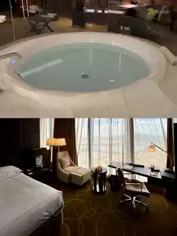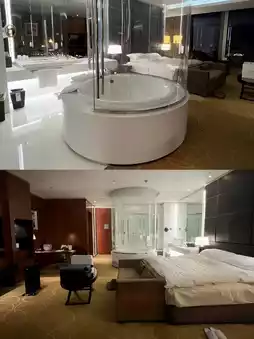 Although the room is old, it is well maintained, and the large round open bathtub is eye-catching. Spacious space, comfortable beds, soft pillows, luxurious bathroom facilities... Standing in front of the window, you can see the entire city of Nanjing. It feels great! The bedding is very comfortable and I fell asleep in a short while at night.