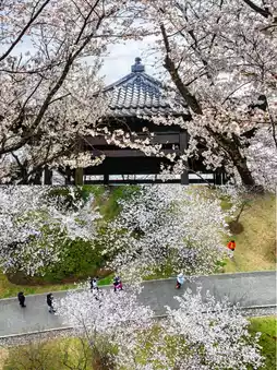 Mountaintop viewing platform: Overlook the city skyline and the panoramic view of the cherry blossom forest, suitable for wide-angle lenses.