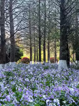On the other side of the small forest, the sunlight penetrates the trees and sprinkles into the forest, and a field of Orychophragmus violaceus blooms in the distance...