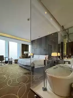 This 15-year-old hotel features 48 sqm rooms with transparent glass partitions between the bathroom and bedroom. Toiletries are from Byredo's BLANCHE series, and the Xuanwu Lake view is spectacular.