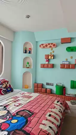 • Super Mario-themed room: full of childlike fun with red pipe decorations, equipped with an 85-inch HD projection screen