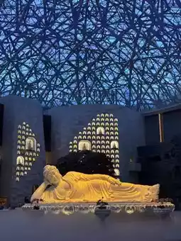 The Grand Buddha Palace (佛顶宫): Enter a 360° sunken palace resembling a cosmic lotus floating on a lake. Beneath its titanium dome lies a staggering 9-story underground palace, adorned with vaulted corridors, 10,000 Buddha niches, and a 21.8-meter reclining Buddha bathed in celestial light.