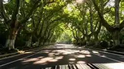 Phoenix Tree Avenue: Century-old phoenix tree branches intertwine, weaving an endless green tunnel in the sky. Sunlight filters through dense leaves, casting dancing light spots on the asphalt road, like a natural piano playing with light and shadow.