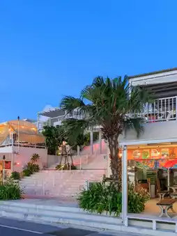 Stroll through this Okinawa-inspired street lined with towering palm trees and feel the unique sea island climate.