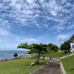 The weather forecast in Okinawa is very inaccurate (you can refer to the weather forecast software tenki, which is slightly more accurate). So after getting up in the morning and checking the weather, I decided to take a taxi there. It takes 40 minutes to go through the international bus, and 5,600 yen after the international DiDi coupon (500 yen off for each of the first 10 orders for newcomers). Since there are three people, it’s actually okay on average. If we go back, the waiting time for 338 is too long. We took B2 to Nanjo City, and then took Didi back to the city. In the middle, we passed a beach called Sun sun beach. It’s 1.4 kilometers away from Cape Chinen. It’s not bad when the weather is sunny. There are many chairs on the beach for taking pictures. It’s better.