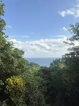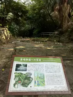 Reaching a high point on Sefa Utaki, the view opens up suddenly. Beyond the lush greenery, the blue ocean comes into view. An explanatory sign reads, "Kutakajima Remote Observation Site." This was an important sacred site during the Ryukyu Kingdom era, where people worshipped Kudakajima from afar.