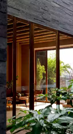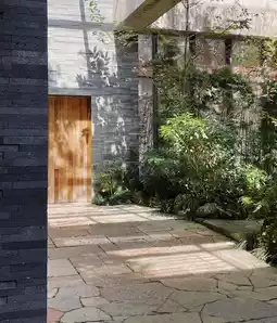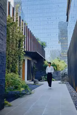 Hidden among the high-rise buildings with glass curtain walls, the projected image of mountains and green trees is constructed