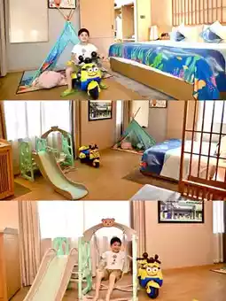 We stayed in a Japanese-style family themed room this time, which was very spacious and adorably decorated. The room had a βΊοΈ small tent, a slide, π΅ a little yellow man motorcycle, picture books, fishing toys, dolls... My son could play in the room for half a day!