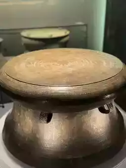 ⑤ Bronze drum with flying egret pattern: The drum surface has a diameter of 56.4 cm, a height of 36.8 cm, and a weight of 30.75 kg. There are patterns of flying egrets, rowing boats, and feathered people dancing on the drum. It is a key object for studying the ancient southern ethnic culture.