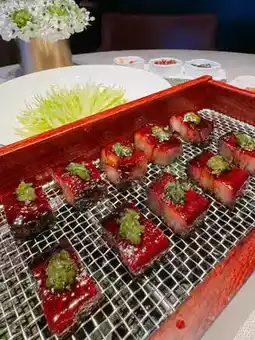 The char siu is served in a wooden box, the inner bottom layer is paved with basil leaves and hot pebbles, the fragrance of basil is slowly smoked on the char siu. Chew the half-fat and lean char siu, the entrance is rich in oil; the strong basil aroma spreads in the mouth, followed by a sweet honey aroma, the char siu on the bell chili, adding slightly spicy taste more tasty, at the same time a little relieving!