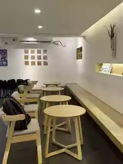 In the middle is a coffee bar, with a raised platform and a large number of wooden coffee tables.