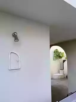 The entire cafe is decorated in white minimalist style with a few flowers and plants