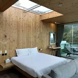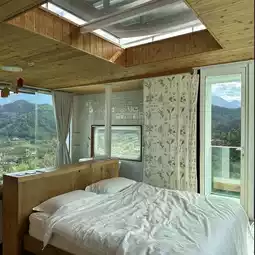 We stayed in the "Sunrise Starry Sky Room", which has a window on the top of the bed, so we can fall asleep accompanied by the starry sky before going to bed at night. The large floor-to-ceiling windows allow us to see the sunrise when we open our eyes, and the clear sky when we wake up at noon. It heals my mood for the whole day! There are seats for 2 people on the balcony. Enjoying the gentle breeze is really relaxing.
