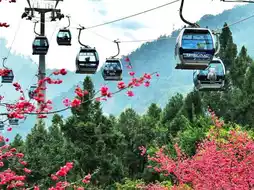 📷 **Ropeway cabins**: Shot from above with blossoms below
