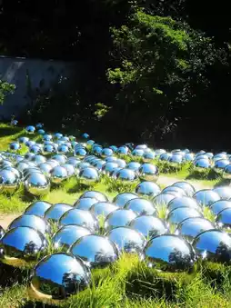 Surrounded by mountains on three sides, this gallery features a trapezoidal floor plan and an angled roof. It showcases Yayoi Kusama's art installations, including thousands of stainless steel silver balls scattered throughout the building and garden, gleaming brightly.
