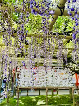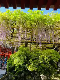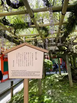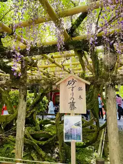 Located in the grounds of Kasuga Taisha Shrine's main shrine (Omiya), this wisteria trellis is over 700 years old. It was given this name because in early May the flower clusters grow to over 1m and rub against the sand. Kasuga Taisha Shrine has long been famous for its wisteria, and the "downward wisteria" is even used as the shrine's crest.