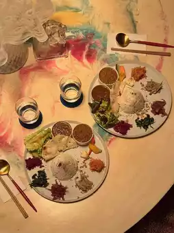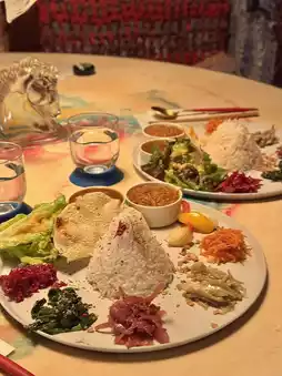 Early red achar, marinated mushrooms, carrot slaw, spiced fruit, salted natto, purple cabbage coleslaw, komatsuna namul, and original dressing salad.