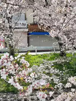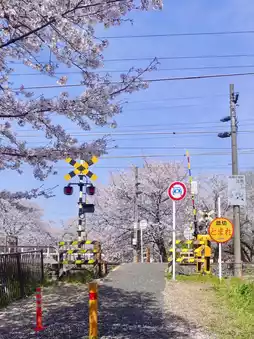 Walk along the cherry blossom grove by the railway, and after about 10 minutes, you'll reach a spot where the sakura and tracks create the perfect photo opportunity. 🚉🌸