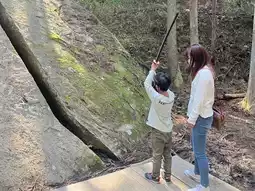 A sword for photography is placed in front of the giant, split Ittoishi Stone (lol).