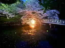 You can see this Ukimido at Sagiike Pond in the park✨It's still beautiful during the daytime when the cherry blossoms and autumn leaves are blooming, but I recommend early morning, evening, and night.