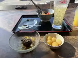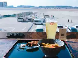 The lounge has several seating areas and a variety of food and beverages, including hot and cold food, snacks, and can be selected at the counter bar. Try ordering a snack and a small set of beef rice bowls. It's perfect for a place to sit and wait for your flight.