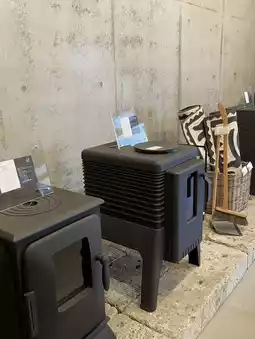 Various wood stoves are on display, and some stoves are being demonstrated.