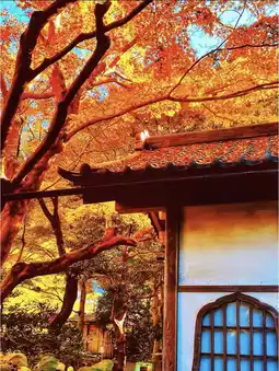 🍁 During the autumn foliage season, Meigetsu-in Temple offers a breathtaking view through the circular window ⭕ of its main hall, showcasing the vibrant red and yellow trees in the rear garden as if framed in a deep crimson picture frame. Kamakura also features other temples like Tsurugaoka Hachimangu Shrine and Hase-dera Temple 🔔, making it worth spending a leisurely day exploring the area's autumn beauty.