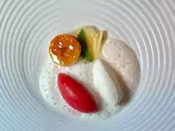 The meal begins with three French countryside-style appetizers, offering a delightful introduction to the flavors. The crab roe-filled triangular pastry is especially noteworthy. Next comes the Sanriku seafood salad, featuring a bounty of fresh catches from Miyagi's Sanriku coastline—fish, shrimp, shellfish, abalone, squid, and octopus. The freshness is unparalleled, and the Shiogama-grown vegetables, enhanced with orange, egg yolk, and vinaigrette, create a feast for both the eyes and the palate. Following this is the white wine-steamed abalone and pan-seared scallops, served with a sauce made from shellfish broth and turnip leaves. The layered sweetness and delicate flavors are extraordinary. The pan-seared tilefish with red onion sauce surprises with its crispy skin and the unique taste of the sauce, showcasing the versatility of red onions. The ginger sorbet is intriguing, combining ginger's aroma with floral notes, and its refreshing sweetness makes it disappear in an instant. The Sendai filet mignon with Madeira red wine sauce is lightly seared to perfection, offering a tender and juicy bite. While the foie gras melts in the mouth, it feels slightly less creamy than expected. The strawberry and sake lees sorbet with sauce is so delicious it makes you want to cheer. The subsequent desserts, both large and small, maintain a high standard.