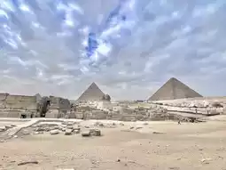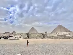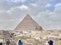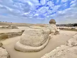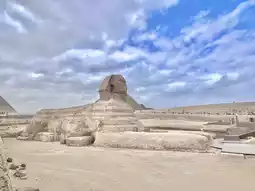 The Great Sphinx of Giza is one of Egypt's most iconic ancient statues. Standing before the Giza Pyramids, it faces east to greet the rising sun. A massive stone sculpture with the body of a lion and the face of a pharaoh, it measures approximately 73 meters long and 20 meters tall. It is said to symbolize the pharaoh's lion-like strength and his duty to protect his people.