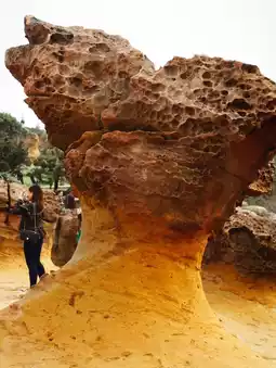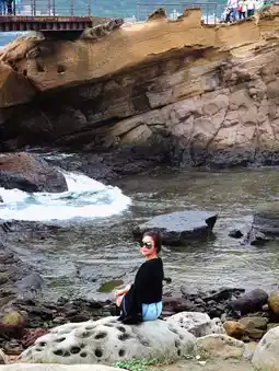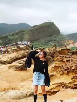 When overlooked from above, the place is like a giant turtle submerging into the sea. Thus, it is also called "Yehliu Turtle." Because the rock layer of seashore contains sandstone of limestone texture and it is subject to sea erosion, weathering and earth movements, there is particular scenery consisting of sea trenches/holes, candle shaped rocks, and pot shaped rocks.