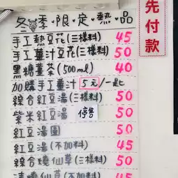 Features: I highly recommend this store's "Mixed Brown Sugar Shaved Ice"! The freshly brewed brown sugar is rich and fragrant, and is paired with 4 ingredients of your choice. A large bowl costs only NT$55. The ingredients are also freshly made by the young sisters every day. Each ingredient costs only NT10, and a few like taro and pineapple are NT15. I also recommend their soy milk and tofu pudding, which is made with real ingredients and full of soybean flavor. A large bowl with three optional toppings is only NT50!
