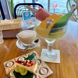 I ordered a cafe latte, coconut mango frappe, and cheesecake,