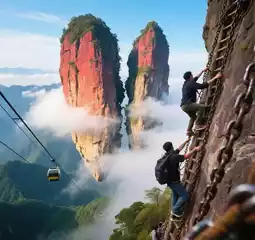The most famous rock ridge of the Emperor's Palace is a bit scary to walk on, with steep cliffs on both sides. Fortunately, there are guardrails to grab, but the scenery is really amazing! There is a long vertical iron ladder on the East and West Peaks, which is quite challenging. You have to climb to the top to see the endless mountains and peaks. The scene is quite magnificent.