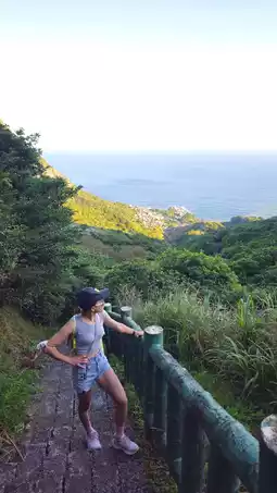The mountain is surrounded by lush greenery and beautiful scenery, overlooking the coastline, mountains, and old streets of Jiufen and Jinguashi.