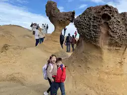 When we travel to Taipei, we usually go to different night markets for snacks and milk tea! Today, our family decided to appreciate Taiwan from another angle and explore the Yehliu Geopark. This geopark is mainly composed of sedimentary sandstone, then through the sea breeze, sea water, nature's miraculous carvings, resulting in a series of extremely stylish natural stone sculptures including ice cream stone, love heart stone, queen head stone and so on. The park is located in New Taipei City, north of Taipei. It takes about 50 minutes by car from the Taipei City Center Hotel, which is very convenient. When we came to the park gate, we first took a floor plan and brief introduction of Yehliu Geopark to make it easier to find the different stone sculptures in the park. There is also a large map erected next to the entrance, so you can slowly check the attractions you want to enjoy. After a short walk along the seaside, we can see many different stone sculptures. The food-loving brother loves the mushroom stone, which looks a bit like a tea tree mushroom from a distance. The sister is the most loving stone. She also found some small fossils in the ground next to the stone sculpture! Families and friends who are preparing to travel to Taipei, you may wish to come to Yehliu Geopark with your children to enjoy this magnificent natural creation!