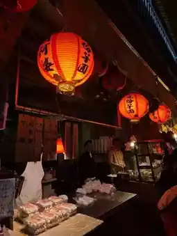 The red lanterns dripping with raindrops created a subtle atmosphere even during the day, and the warm aroma of food wafting from the stalls was even more alluring!