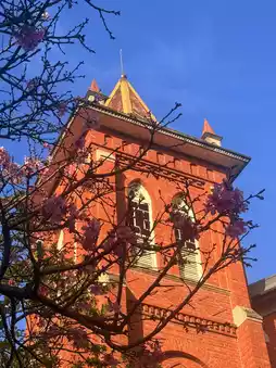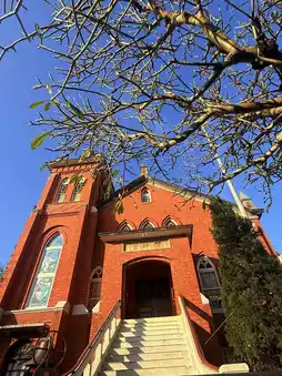 Today, the chapel has become a striking red Gothic-style building. The front of the church features the Holy Trinity, and the bell tower depicts the Christian doctrine of the Five Loaves and Two Fish. To commemorate Reverend Mackay's contributions to Taiwan, there is a small slope behind the chapel showcasing artworks by various artists depicting Mackay's medical practice and the chapel. Notably, the first piece is by the famous Taiwanese painter Chen Cheng-po.