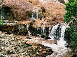 The water of this waterfall appears to shimmer in a golden hue. This phenomenon is due to the remnants of gold mining activities in the area. Minerals from the mines mixed with groundwater, oxidizing to create the golden color.