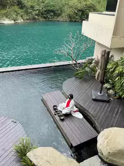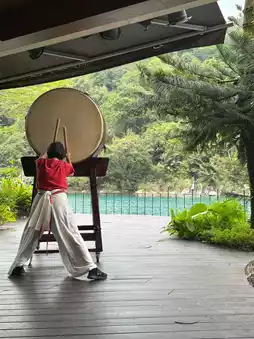 The hotel's afternoon "singing bowl and drumming performance" was a delightful surprise! Sitting on the riverside lawn, listening to the harmonious music mixed with the sound of the stream, and feeling sunlight filtering through the treetops—it felt like time had stopped. After the performance, grab a "wasabi ice cream" (NT$80) for a unique blend of salty and sweet flavors.