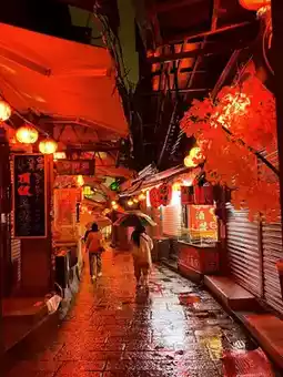 As the sun sets, the red lanterns begin to glow, lighting up every narrow stairway and alley like scenes from a Ghibli film 🎥. The air carries the faint aroma of oolong tea, grilled mochi, and nostalgia. 🍵🍡