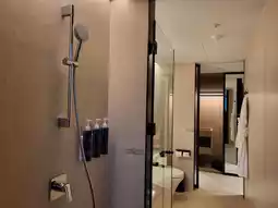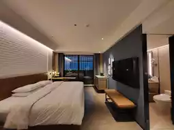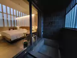 The guest rooms continue the overall style, dominated by neutral tones complemented by wooden materials and soft lighting, creating a tranquil and comfortable resting space. Some room types include a balcony with views of the Tamsui River or Guanyin Mountain. The furniture is simple yet highly functional, while the bathrooms feature a dry-wet separation design with stone textures, aligning with the brand's positioning and regional characteristics, showcasing refined details within simplicity.