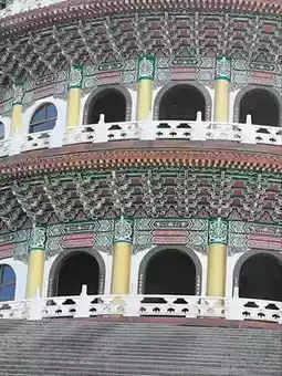 Wuji Tianyuan Temple’s architecture is a striking sight, with its grand five-story pagoda crowned by a golden finial, similar to the Temple of Heaven in Beijing. Circular tiers adorned with intricate carvings and vivid colors reflect a graceful blend of traditional design and modern craftsmanship. Standing tall against Tamsui’s lush backdrop, the temple’s symmetry and elegance make it a true masterpiece in the skyline.