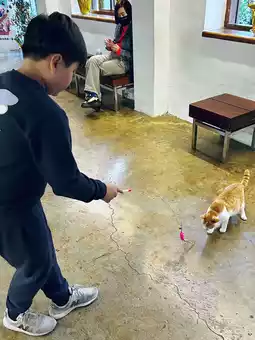 At first, the cats approached cautiously, but as soon as I shook the toys, their eyes lit up and they came running. Their tails wagging and jumping around were so adorable, I lost track of time playing with them. As soon as I took out the Churu treats, one of them even climbed onto my lap and put his face in my mouth. The sight of them gently licking them made me smile.