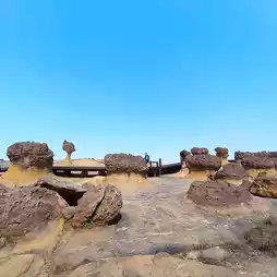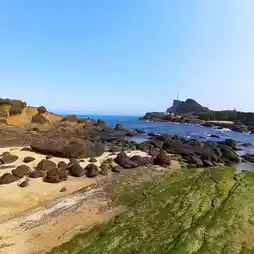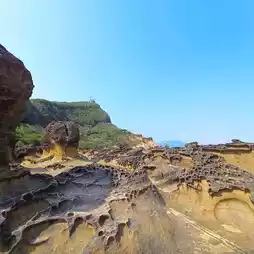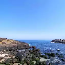 The weather is nice, the view is beautiful, the blue sea contrasts with the yellow rocks.