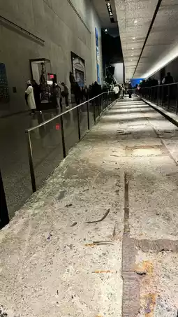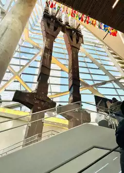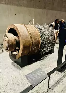 There are many tourists, you need to queue up to buy tickets to enter, the elevator down 2 floors of the foundation space, next to the original building steel pillars, burned and deformed steel beams.