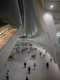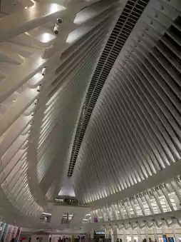 "The Oculus" at the World Trade Center is a futuristic building designed by Spanish architect Santiago Calatrava. It features a design resembling spreading white wings, and the interior is an open space where light pours in. It is a key transportation hub where the subway and PATH trains run, but it is also popular as a shopping mall with luxury brand shops and restaurants.