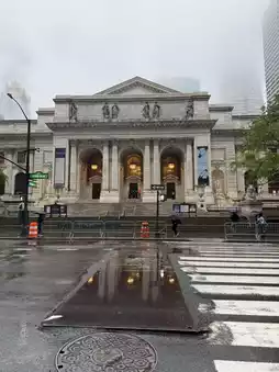 As we turned into 5th Avenue, the mood shifted — umbrellas everywhere, reflections on the wet pavement, and the soft glow of storefront lights. We passed the grand New York Public Library, then caught sight of the bold Louis Vuitton trunk installation, standing like a sculpture in the middle of Manhattan.