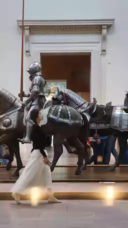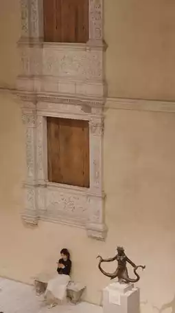 This is a sculpture exhibition in the atrium, near the entrance of the building to the right of the golden archery sculpture.